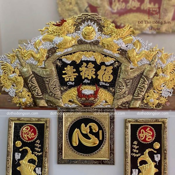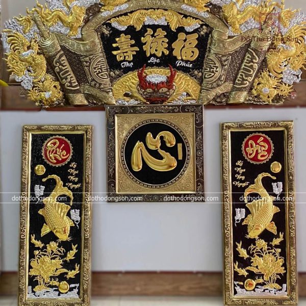 | Kích thước cụ thể | Cuốn thư: dài 1m55 x cao: 68cm – Câu đối: cao 1m55 x ngang: 25cm. Tranh Lý ngư vọng nguyệt: dài 100cm x rộng 40cm. Tranh chữ Tâm: dài 55cm x rộng 55cm |