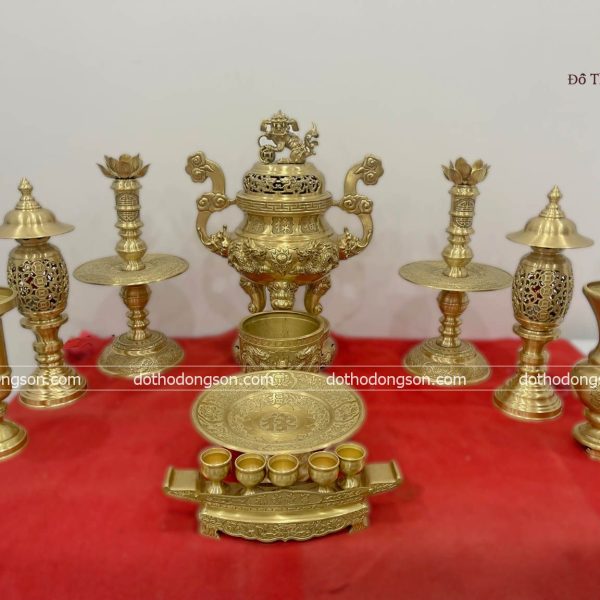 – Họa tiết tinh tế: Bộ Đồ Thờ bằng đồng được trang trí nhiều họa tiết hoa văn mang ý nghĩa tốt lành như chim hạc, rồng, sen, phượng hoàng. Một số Bộ Đồ Thờ cao cấp còn được dát vàng, khảm tam khí, ngũ sắc càng làm tăng thêm sự sang trọng, quý giá nơi thờ tự.
