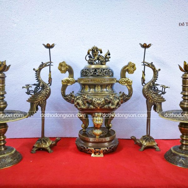 – Họa tiết tinh tế: Bộ Đồ Thờ bằng đồng được trang trí nhiều họa tiết hoa văn mang ý nghĩa tốt lành như chim hạc, rồng, sen, phượng hoàng. Một số Bộ Đồ Thờ cao cấp còn được dát vàng, khảm tam khí, ngũ sắc càng làm tăng thêm sự sang trọng, quý giá nơi thờ tự.