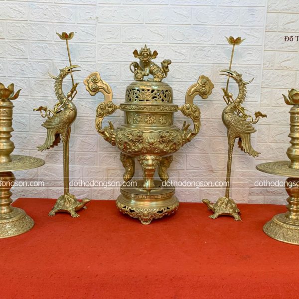 – Họa tiết tinh tế: Bộ Đồ Thờ bằng đồng được trang trí nhiều họa tiết hoa văn mang ý nghĩa tốt lành như chim hạc, rồng, sen, phượng hoàng. Một số Bộ Đồ Thờ cao cấp còn được dát vàng, khảm tam khí, ngũ sắc càng làm tăng thêm sự sang trọng, quý giá nơi thờ tự.