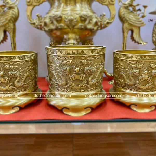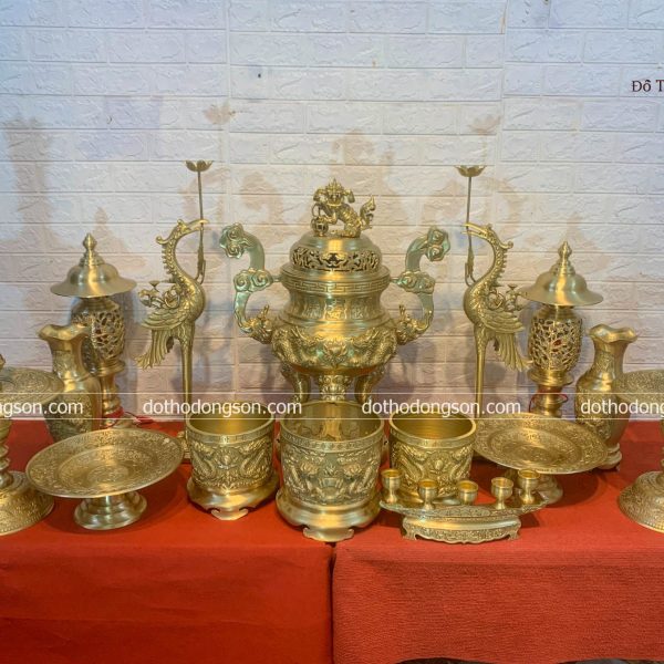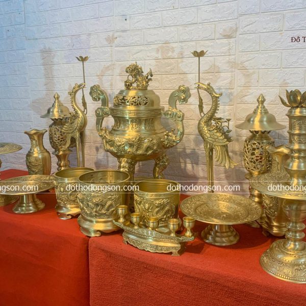 – Họa tiết tinh tế: Bộ Đồ Thờ bằng đồng được trang trí nhiều họa tiết hoa văn mang ý nghĩa tốt lành như chim hạc, rồng, sen, phượng hoàng. Một số Bộ Đồ Thờ cao cấp còn được dát vàng, khảm tam khí, ngũ sắc càng làm tăng thêm sự sang trọng, quý giá nơi thờ tự.