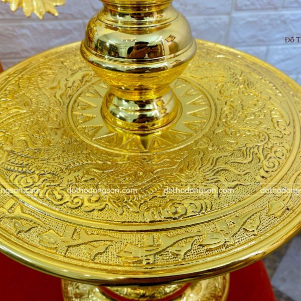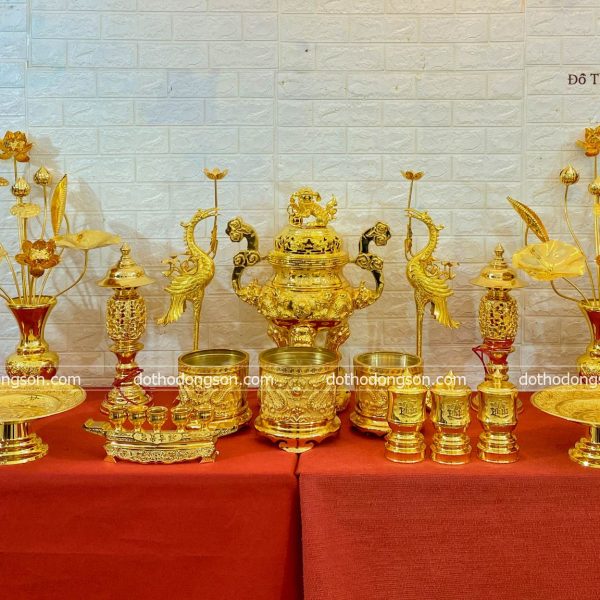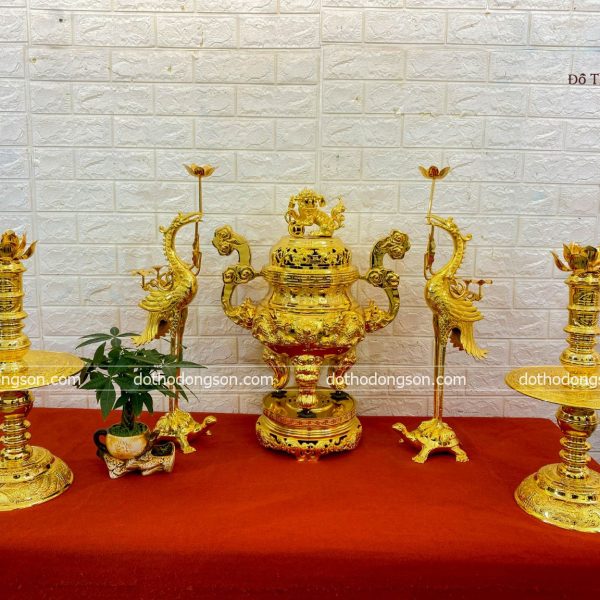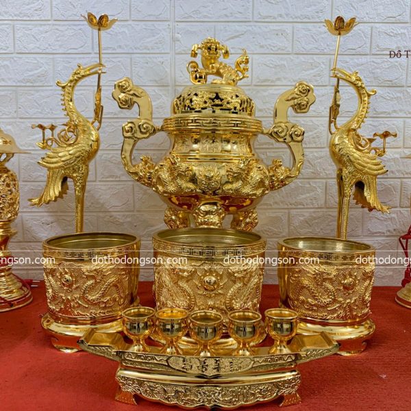 – Họa tiết tinh tế: Bộ Đồ Thờ bằng đồng được trang trí nhiều họa tiết hoa văn mang ý nghĩa tốt lành như chim hạc, rồng, sen, phượng hoàng. Một số Bộ Đồ Thờ cao cấp còn được dát vàng, khảm tam khí, ngũ sắc càng làm tăng thêm sự sang trọng, quý giá nơi thờ tự.