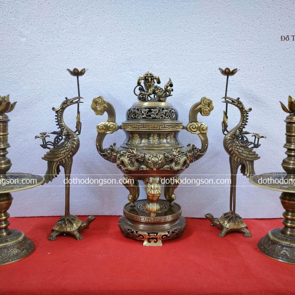 – Họa tiết tinh tế: Bộ Đồ Thờ bằng đồng được trang trí nhiều họa tiết hoa văn mang ý nghĩa tốt lành như chim hạc, rồng, sen, phượng hoàng. Một số Bộ Đồ Thờ cao cấp còn được dát vàng, khảm tam khí, ngũ sắc càng làm tăng thêm sự sang trọng, quý giá nơi thờ tự.