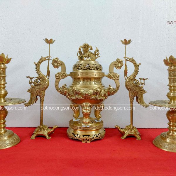 – Họa tiết tinh tế: Bộ Đồ Thờ bằng đồng được trang trí nhiều họa tiết hoa văn mang ý nghĩa tốt lành như chim hạc, rồng, sen, phượng hoàng. Một số Bộ Đồ Thờ cao cấp còn được dát vàng, khảm tam khí, ngũ sắc càng làm tăng thêm sự sang trọng, quý giá nơi thờ tự.