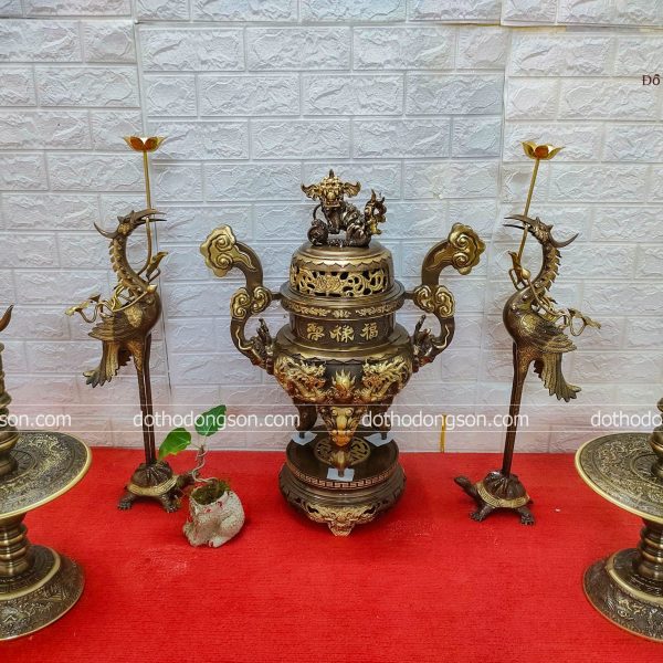 – Họa tiết tinh tế: Bộ Đồ Thờ bằng đồng được trang trí nhiều họa tiết hoa văn mang ý nghĩa tốt lành như chim hạc, rồng, sen, phượng hoàng. Một số Bộ Đồ Thờ cao cấp còn được dát vàng, khảm tam khí, ngũ sắc càng làm tăng thêm sự sang trọng, quý giá nơi thờ tự.