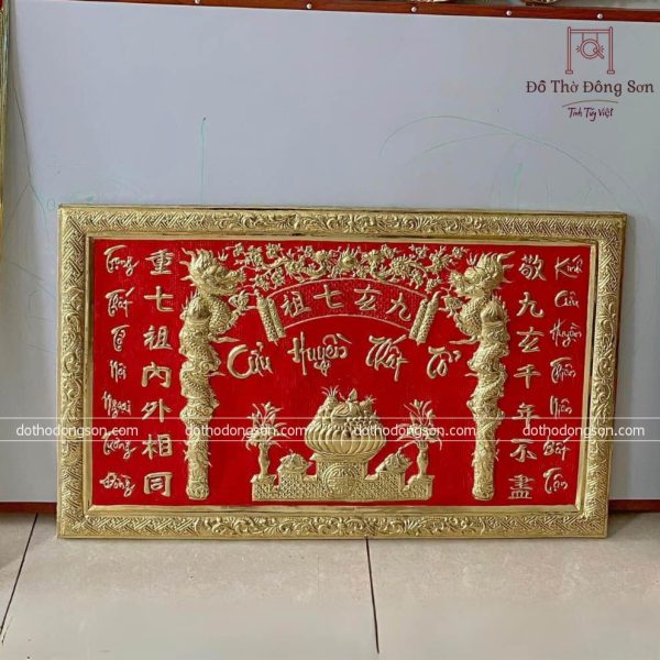 | Kích thước cụ thể | Cuốn thư: Dài 155cm – Cao 78cm Câu đối: Cao 155cm – Rộng 25cm Tranh Cửu huyền thất tổ: 100cm x 60cm |