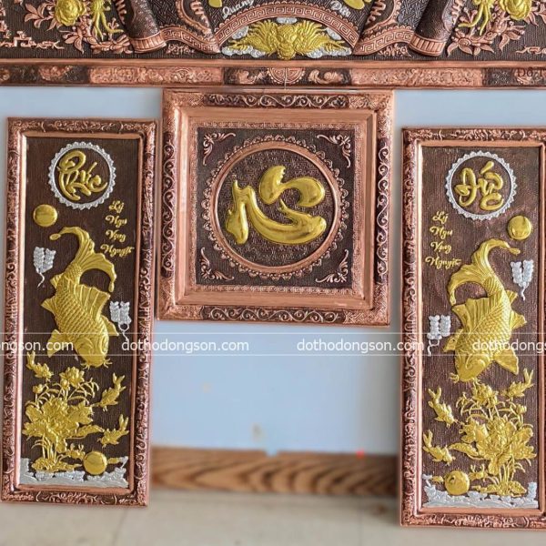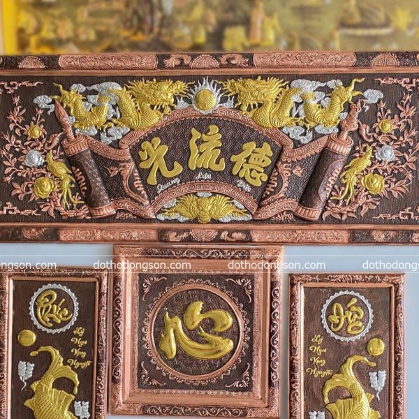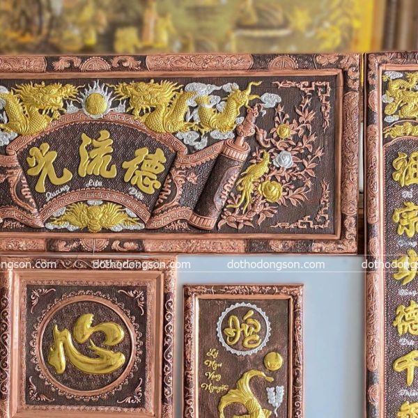 – Họa tiết tinh tế: Hoành Phi Câu Đối bằng đồng được trang trí nhiều họa tiết hoa văn mang ý nghĩa tốt lành như rồng, phượng hoàng, hoa sen, dơi. Một số Hoành Phi Câu Đối cao cấp còn được mạ vàng, khảm tam khí ngũ sắc để tăng sự sang trọng, quý phái nơi thờ tự.