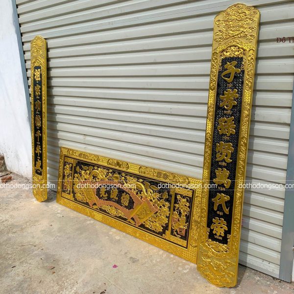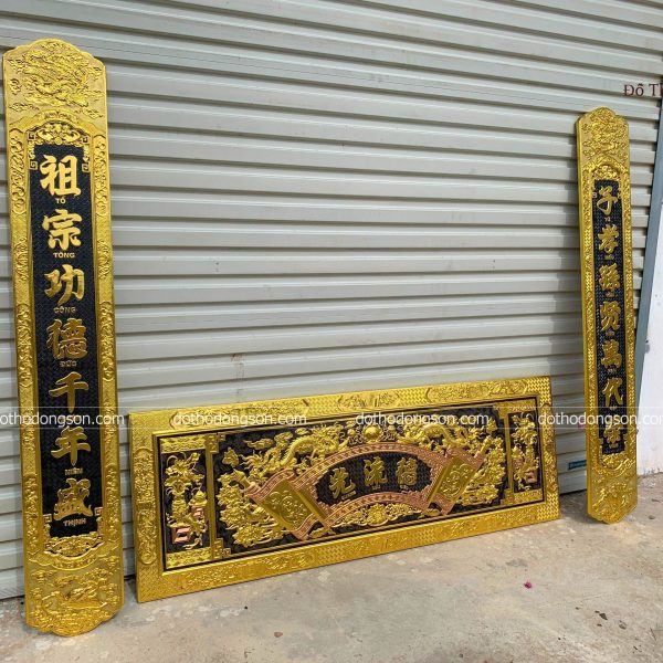 | Kích thước cụ thể | Hoành phi: Dài 176cm – Cao 68cm Câu đối: Cao 176cm – Rộng 25cm |