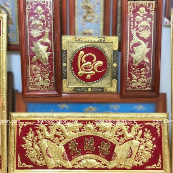| Kích thước cụ thể | Hoành phi: dài 1m55 x cao: 65cm – Câu đối: cao 1m55 x ngang: 25cm. Tranh Lý ngư vọng nguyệt: dài 120cm x rộng 40cm. Tranh chữ Lộc: dài 55cm x rộng 55cm |