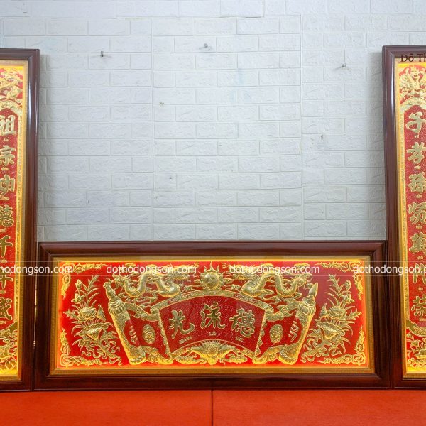 | Kích thước cụ thể | Hoành phi: Dài 155cm – Cao 58cm Câu đối: Cao 155cm – Rộng 25cm |