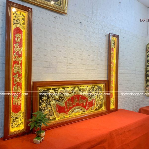 | Kích thước cụ thể | Hoành phi: Dài 176cm – Cao 68cm Câu đối: Cao 176cm – Rộng 25cm |