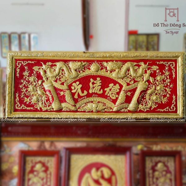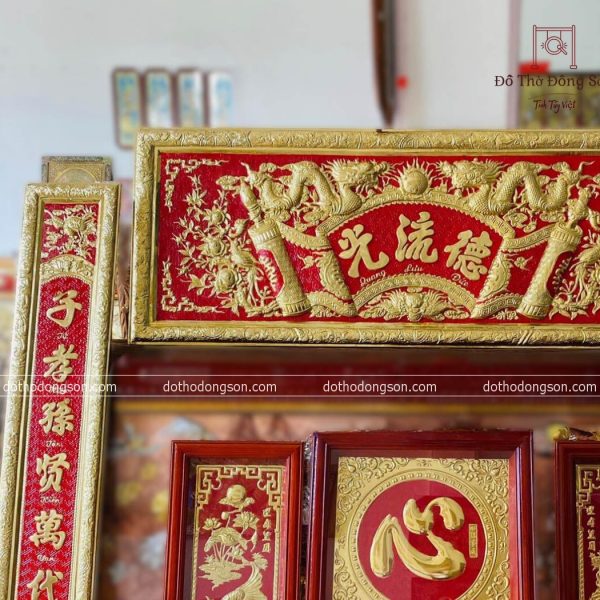 – Họa tiết tinh tế: Hoành Phi Câu Đối bằng đồng được trang trí nhiều họa tiết hoa văn mang ý nghĩa tốt lành như rồng, phượng hoàng, hoa sen, dơi. Một số Hoành Phi Câu Đối cao cấp còn được mạ vàng, khảm tam khí ngũ sắc để tăng sự sang trọng, quý phái nơi thờ tự.