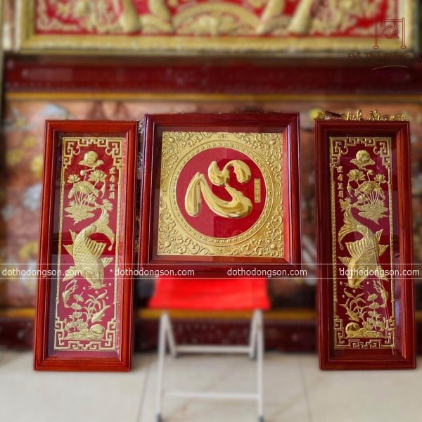 | Kích thước cụ thể | Hoành phi: dài 1m76 x cao: 80cm – Câu đối: cao 1m76 x ngang: 25cm Tranh Lý ngư vọng nguyệt: dài 120cm x rộng 40cm Tranh chữ Lộc: dài 60cm x rộng 60cm |