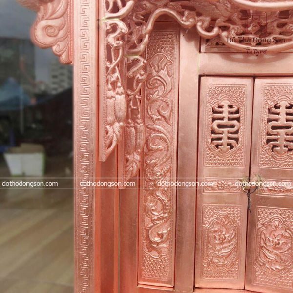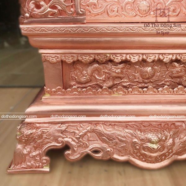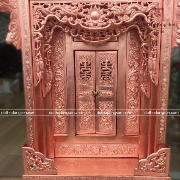 – Họa tiết tinh tế: Ngai Thờ bằng đồng được chạm khắc tinh xảo nhiều hình tượng may mắn như rồng, phương, mặt trời. Một số Ngai Thờ bằng đồng cao cấp còn được mạ vàng, khảm tam khí ngũ sắc để tăng sự sang trọng, quý phái nơi thờ tự.