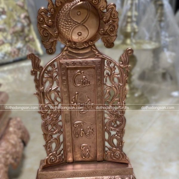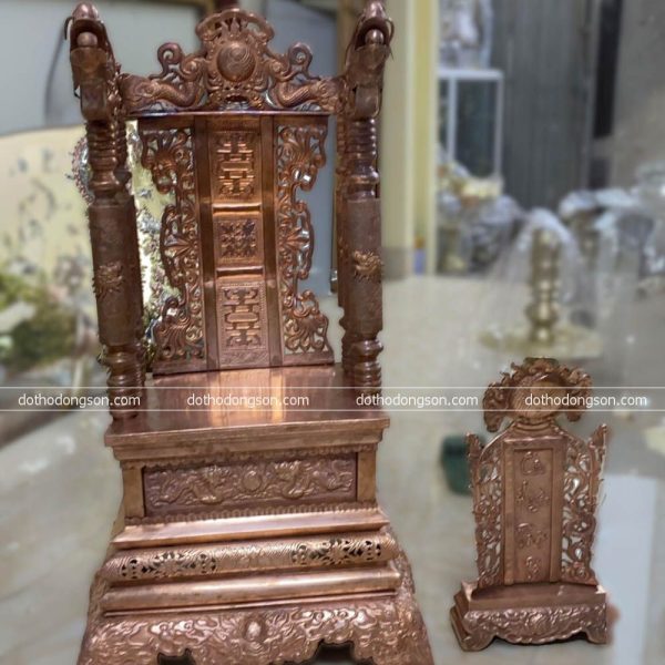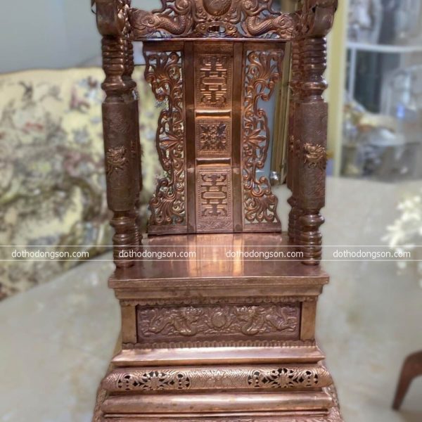 – Họa tiết tinh tế: Ngai Thờ bằng đồng được chạm khắc tinh xảo nhiều hình tượng may mắn như rồng, phương, mặt trời. Một số Ngai Thờ bằng đồng cao cấp còn được mạ vàng, khảm tam khí ngũ sắc để tăng sự sang trọng, quý phái nơi thờ tự.