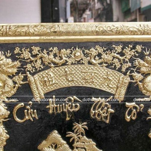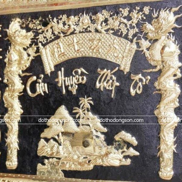 – Họa tiết tinh tế: Tranh Cửu Huyền Thất Tổ bằng đồng được trang trí nhiều họa tiết hoa văn mang ý nghĩa tốt lành như rồng, lân, rùa, phượng hoàng, hoa mẫu đơn, hoa mai, dơi. Một số tranh Cửu Huyền Thất Tổ cao cấp còn được dát vàng, dát tam khí ngũ sắc để tăng sự sang trọng, quý phái nơi thờ tự.