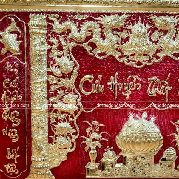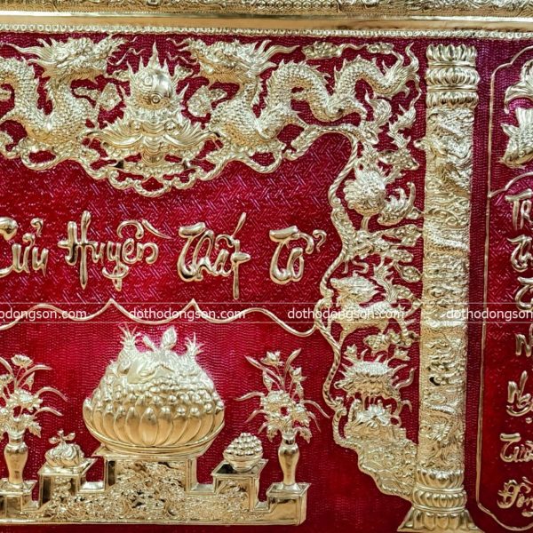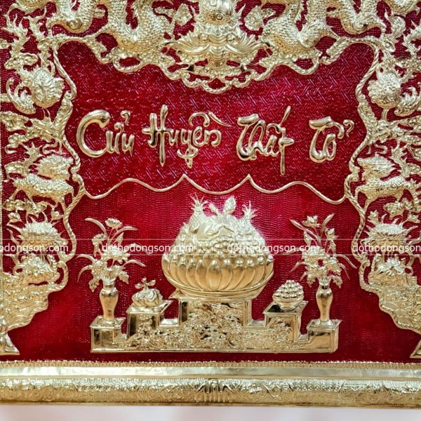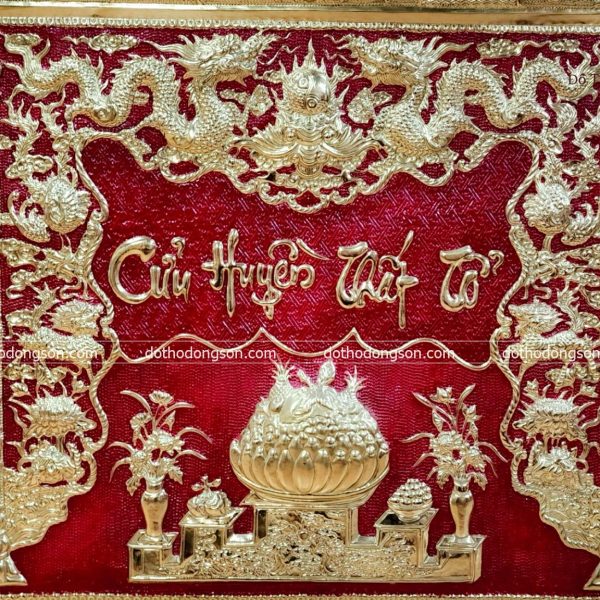 – Họa tiết tinh tế: Tranh Cửu Huyền Thất Tổ bằng đồng được trang trí nhiều họa tiết hoa văn mang ý nghĩa tốt lành như rồng, lân, rùa, phượng hoàng, hoa mẫu đơn, hoa mai, dơi. Một số tranh Cửu Huyền Thất Tổ cao cấp còn được dát vàng, dát tam khí ngũ sắc để tăng sự sang trọng, quý phái nơi thờ tự.