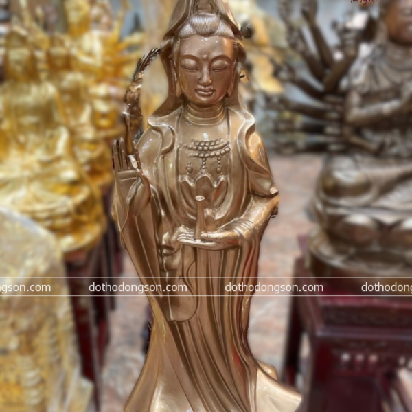 – Họa tiết tinh tế: Tượng Quan Âm Bồ Tát bằng đồng được tạo hình bằng khuôn đất, sau đó chỉnh sửa chi tiết thủ công tỉ mỉ bằng tay nên mỗi bức tượng sẽ sở hữu sắc diện một cách thần thái của Ngài. Một số bức tượng bằng đồng cao cấp còn được mạ vàng, khảm tam khí ngũ sắc để tăng sự sang trọng, quý phái nơi thờ tự.