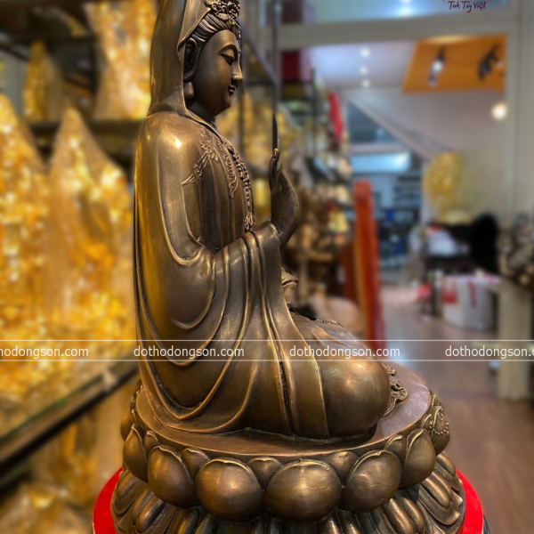 – Họa tiết tinh tế: Tượng Quan Âm Bồ Tát bằng đồng được tạo hình bằng khuôn đất, sau đó chỉnh sửa chi tiết thủ công tỉ mỉ bằng tay nên mỗi bức tượng sẽ sở hữu sắc diện một cách thần thái của Ngài. Một số bức tượng bằng đồng cao cấp còn được mạ vàng, khảm tam khí ngũ sắc để tăng sự sang trọng, quý phái nơi thờ tự.