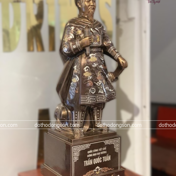 – Họa tiết tinh tế: Tượng Trần Quốc Tuấn bằng đồng được tạo hình bằng khuôn đất, sau đó chỉnh sửa chi tiết thủ công tỉ mỉ bằng tay nên mỗi bức tượng sẽ sở hữu thần thái có nét riêng biệt, thể hiện đầy đủ phong thái và khí chất của Người. Một số bức tượng bằng đồng cao cấp còn được mạ vàng, khảm tam khí ngũ sắc để tăng sự sang trọng, quý phái nơi thờ tự.